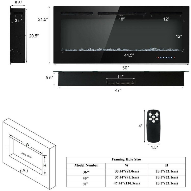 Heater with low 750W and high 1500W power to heat a room quicklyTemperature from 62℉-82℉ to make a warm and cozy environmentCreates realistic flame effects with 9 flame colors and 5 light intensitiesHigh-intensity LED lights with display show brighter and higher flameLED Screen panel and remote control for more convenient operation6 Buttons to set: Power; Color; Flame; Heater; Temperature; and Timer0.5-8 hour timing and overheat protection for efficient and safer useAdvanced metal plate and thickened tempered glass ensure durabilityEasy to install with two options: wall-mounted/recessed installation
