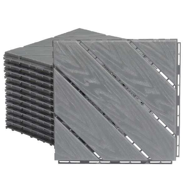 Revitalize your outdoor area with our Plastic Interlocking Deck Tiles. These versatile tiles are designed to elevate the functionality and aesthetics of your patio, porch, balcony, or poolside area. Crafted from high hardness plastic, these interlocking tiles are built to endure various weather conditions, ensuring long-lasting performance without any signs of fading or splintering. The dark grey hue brings a contemporary and stylish touch to your outdoor setting. Installation is a breeze with the innovative interlocking design, allowing you to quickly enjoy your new flooring. With non-slip pads for enhanced safety and a superior water drainage system to keep your space clean and dry, these deck tiles are the perfect choice for a hassle-free outdoor upgrade.